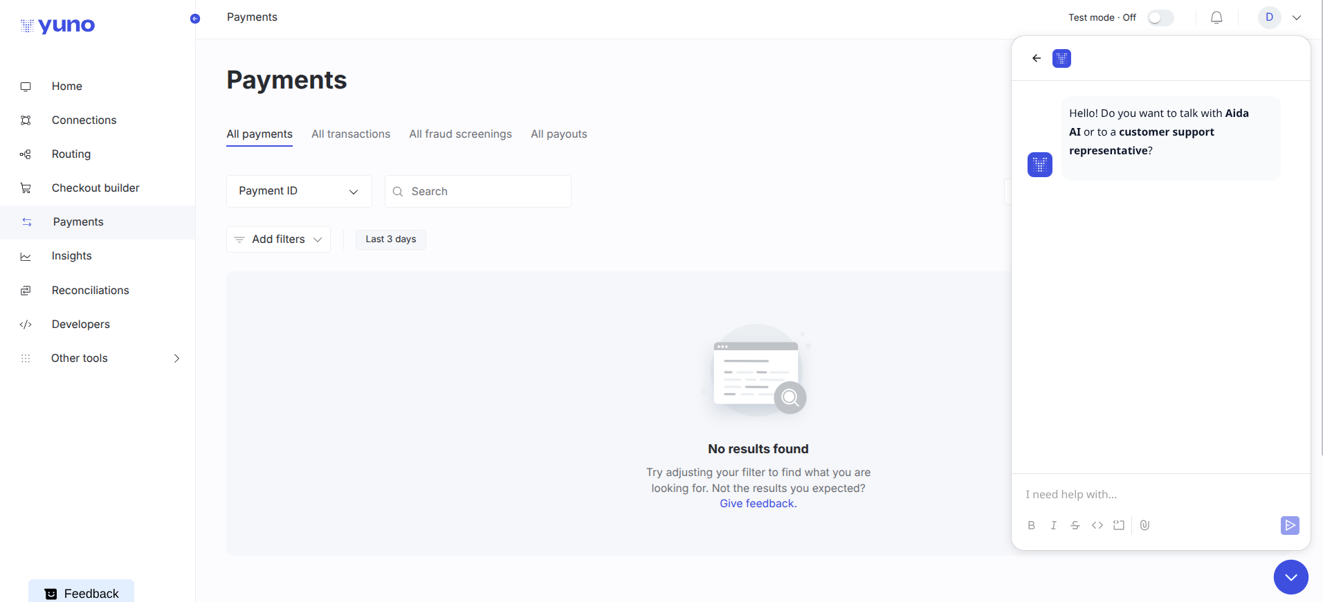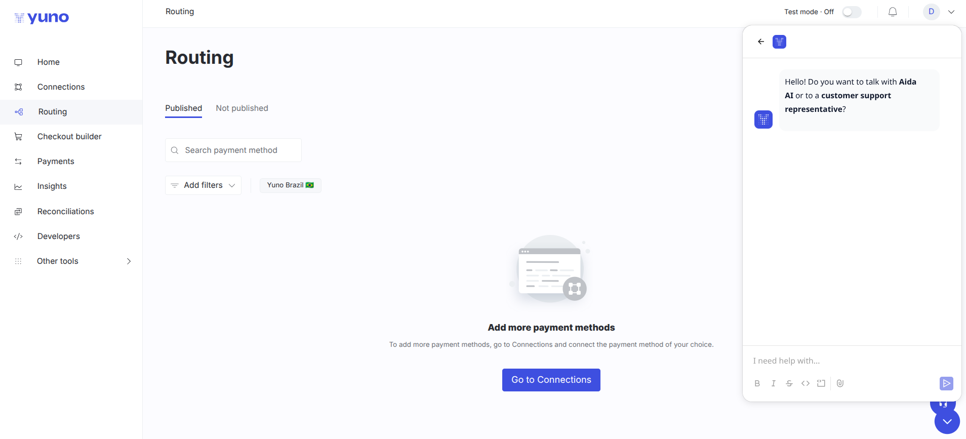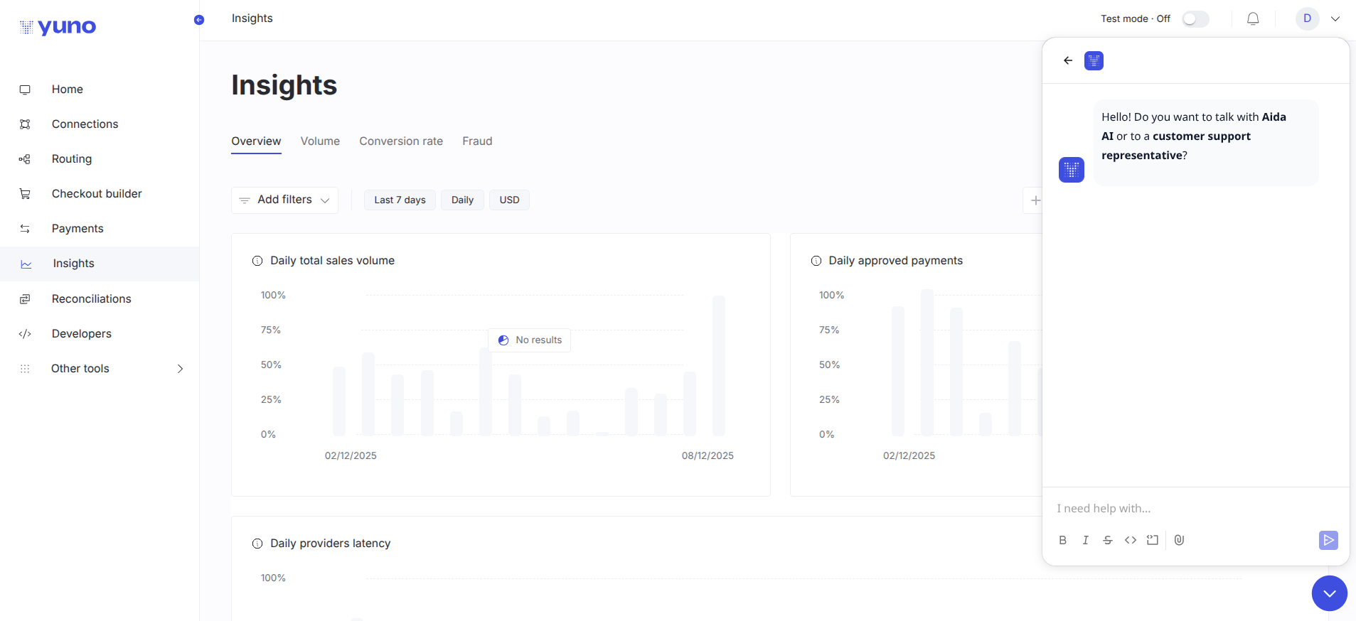 Aida AI is integrated throughout the Yuno Dashboard, providing contextual assistance and AI-powered features directly within different dashboard sections. Aida AI helps you get instant answers, generate insights, and streamline your workflow without leaving the dashboard.