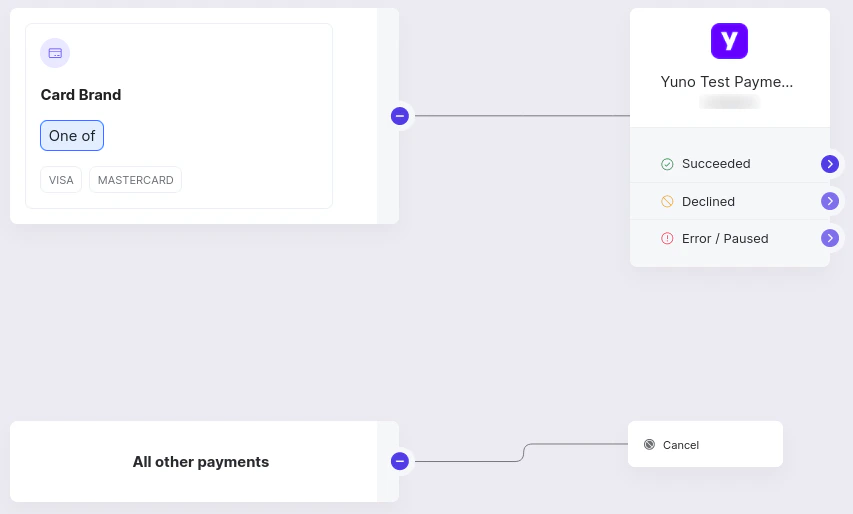 - For the All other payments options, select the Cancel option. The below image presents an example of a routing configuration where the card brand condition was used, accepting payments with Visa and Mastercard brands.