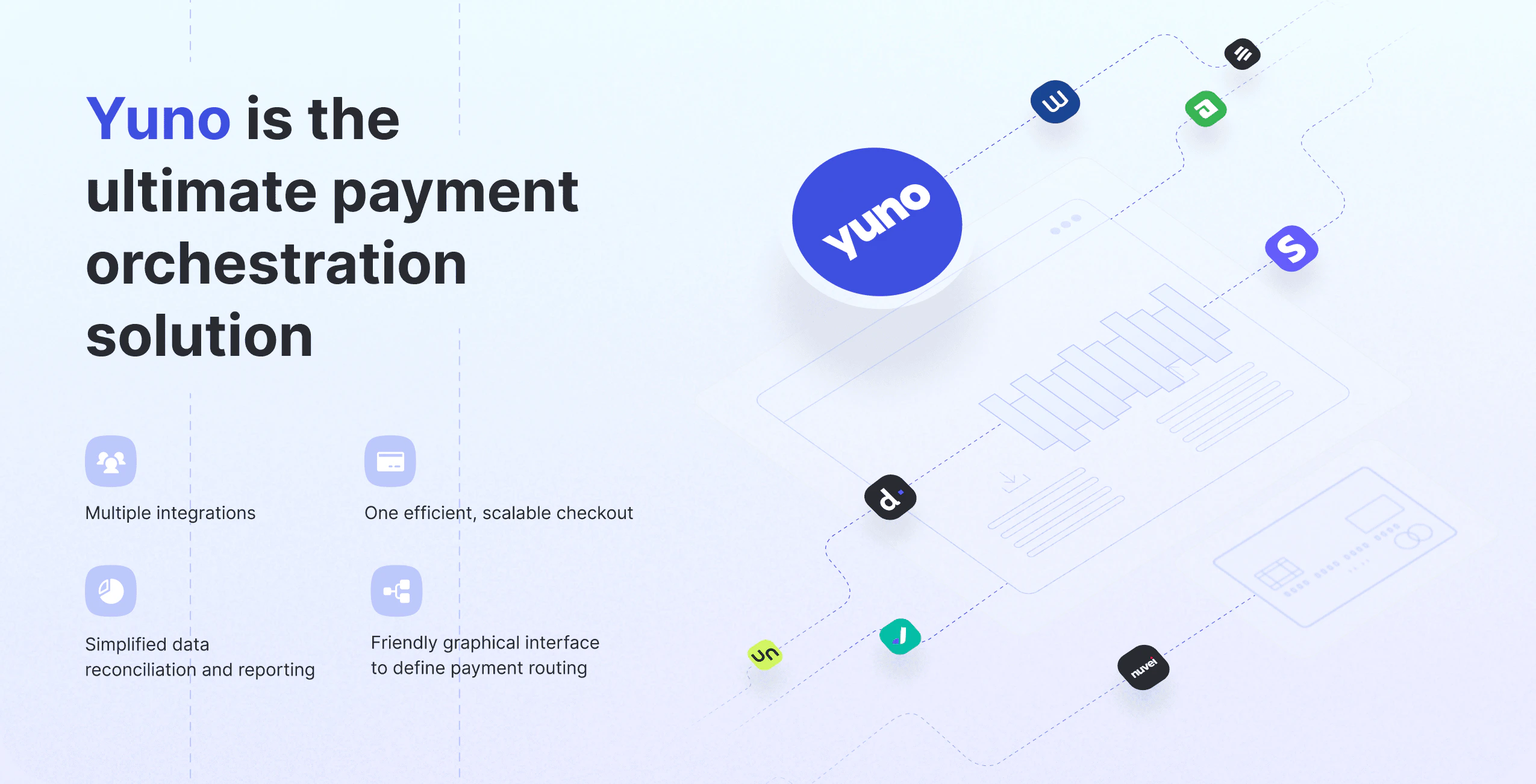 With Yuno, your business gains access to a powerful payment infrastructure designed for efficiency, flexibility, and ease of use.Single Integration