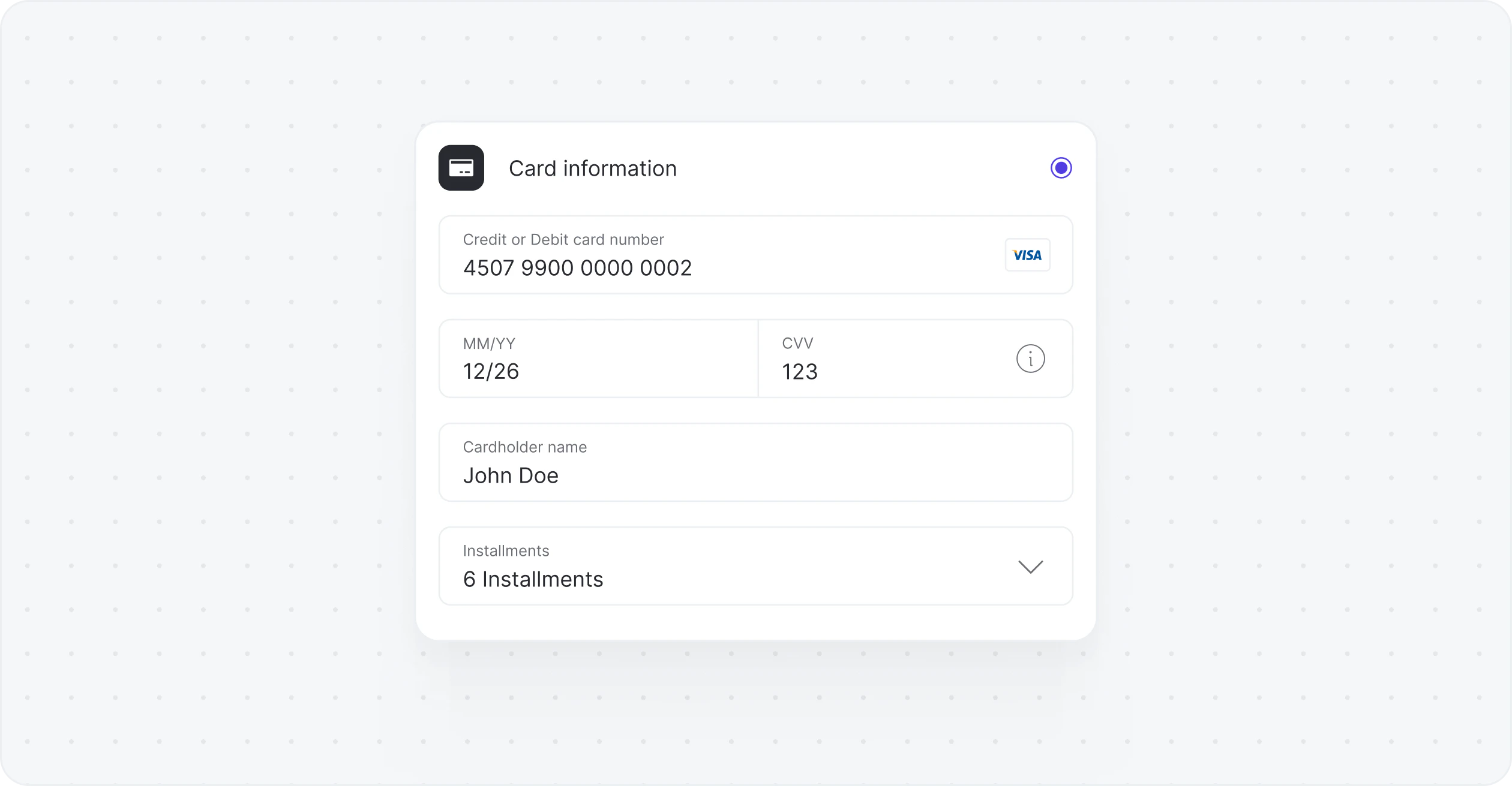 - Provider: When the merchant lacks predefined installment agreements, they rely on the payment processor’s installment options. We work with your chosen provider to access the available installments to offer your customers for each transaction.