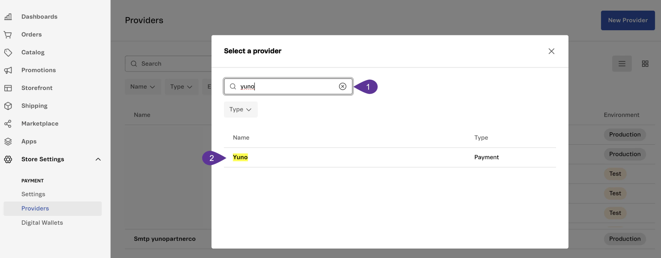 - Search for Yuno on the dialog and select the Yuno option on the results.