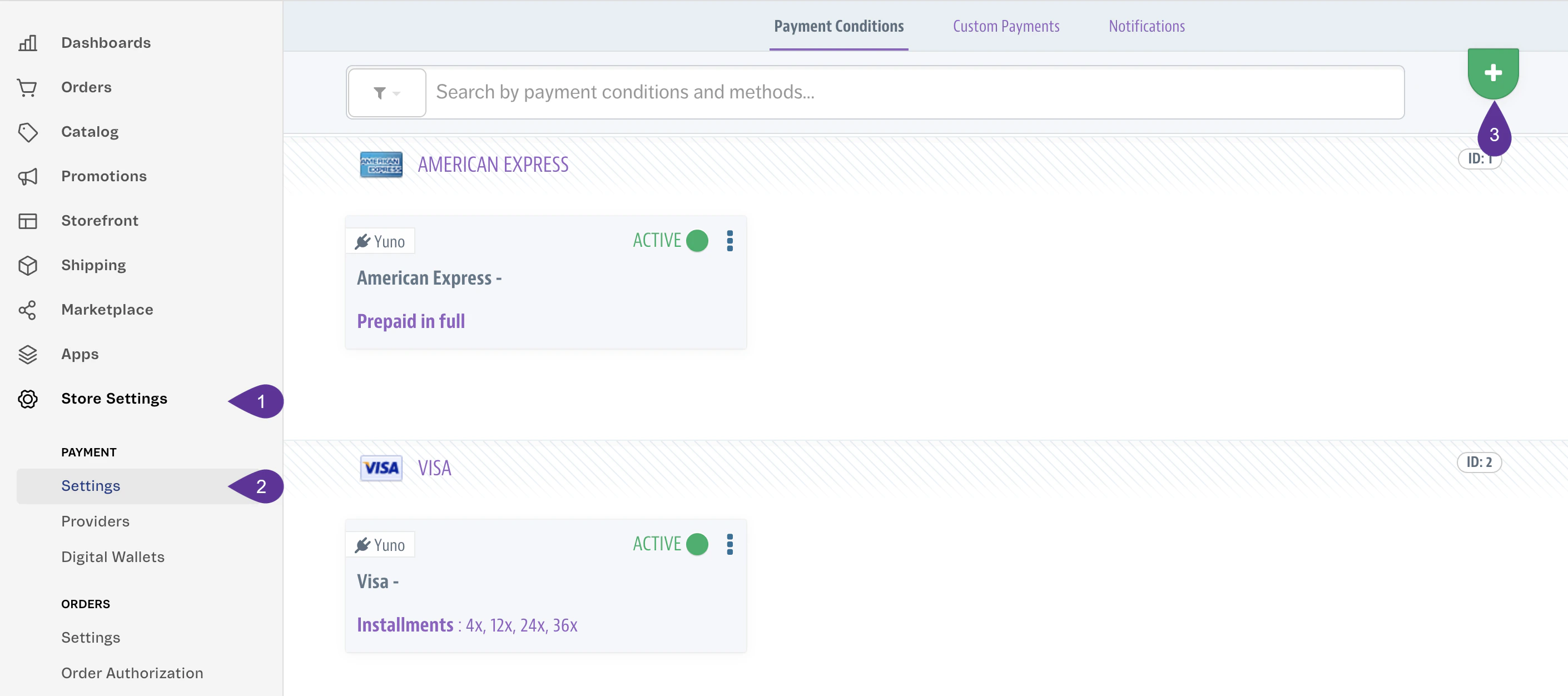 - Navigate to Store Settings > Settings and click the + button (green button at the top right corner) to add a new payment option.