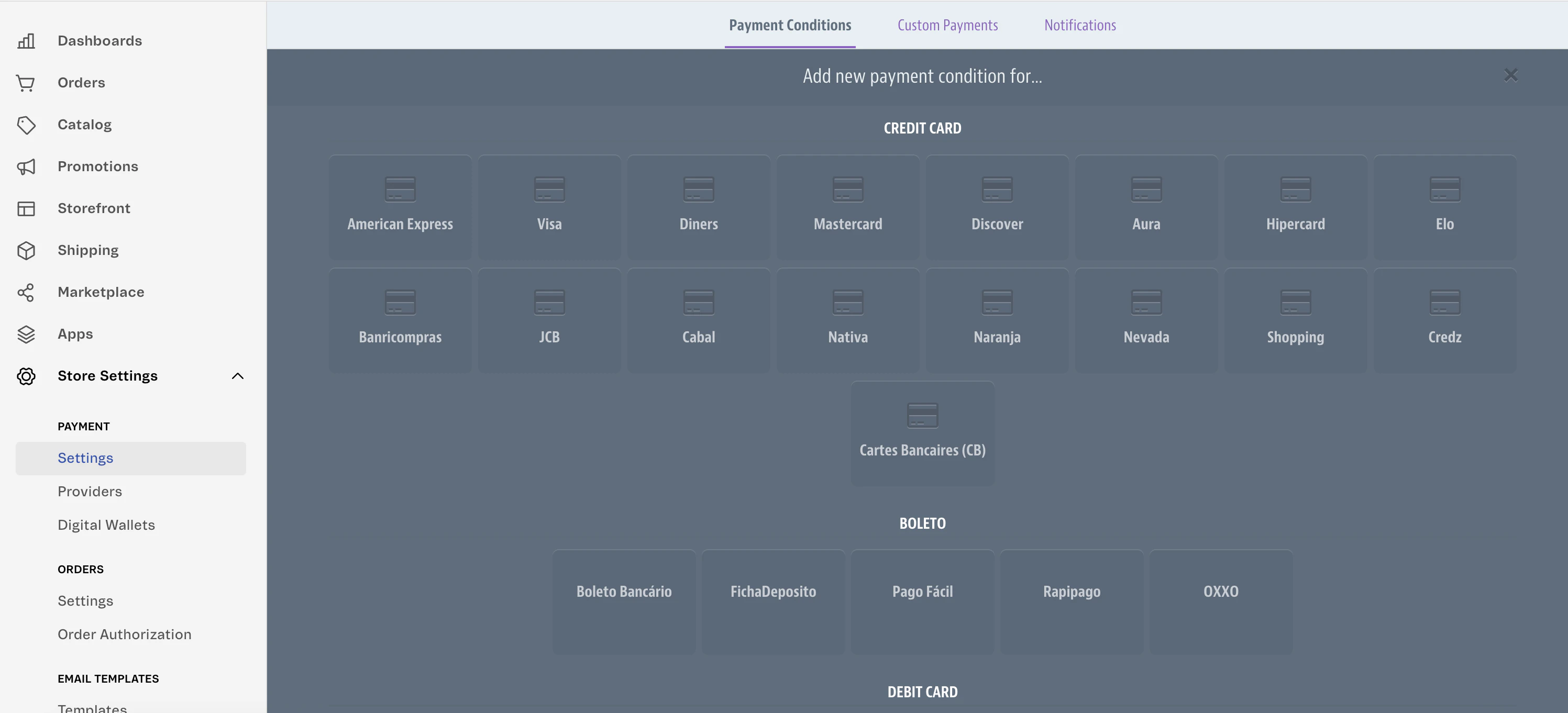- Select the payment method you want to provide for your customer. You need to configure the provider for each payment method you want to make available, including card brands (Visa, Mastercard, etc.), alternative payment methods (PIX, Boleto, Mercado Pago Wallet, etc.), and other payment types.