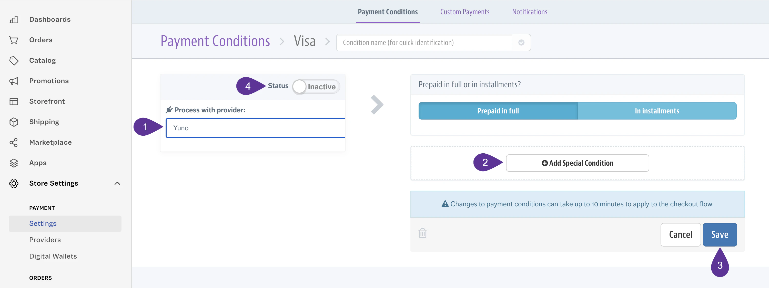 - Add special conditions if necessary. For additional information regarding configuring the special conditions, access Configuring payment special conditions. For further information on configuring payment conditions considering installments with or without interest, check the VTEX page.