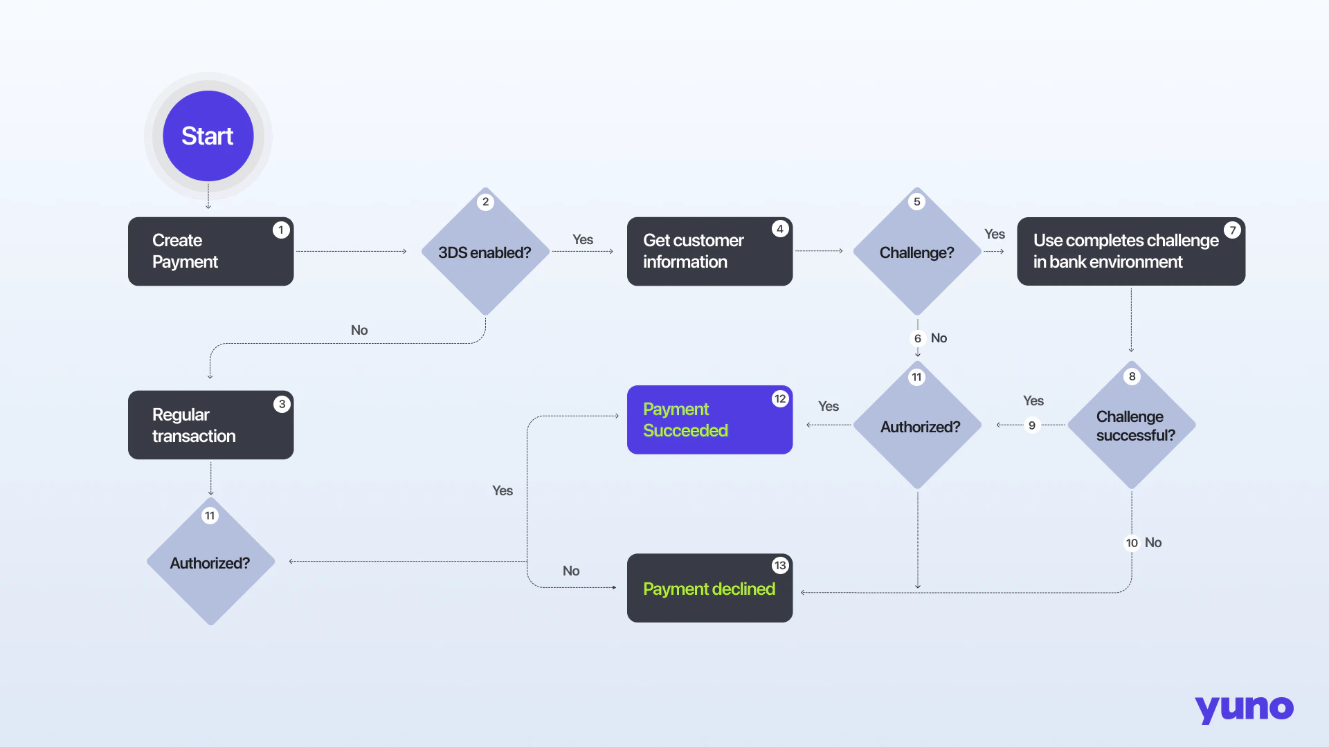 For every scenario the Yuno webhooks will promptly notify you about the outcome of the 3DS challenge and the final payment status. This ensures that you receive real-time updates on the progress and completion of the payment transaction. Also, you can always get the payment information by using our get payment service.