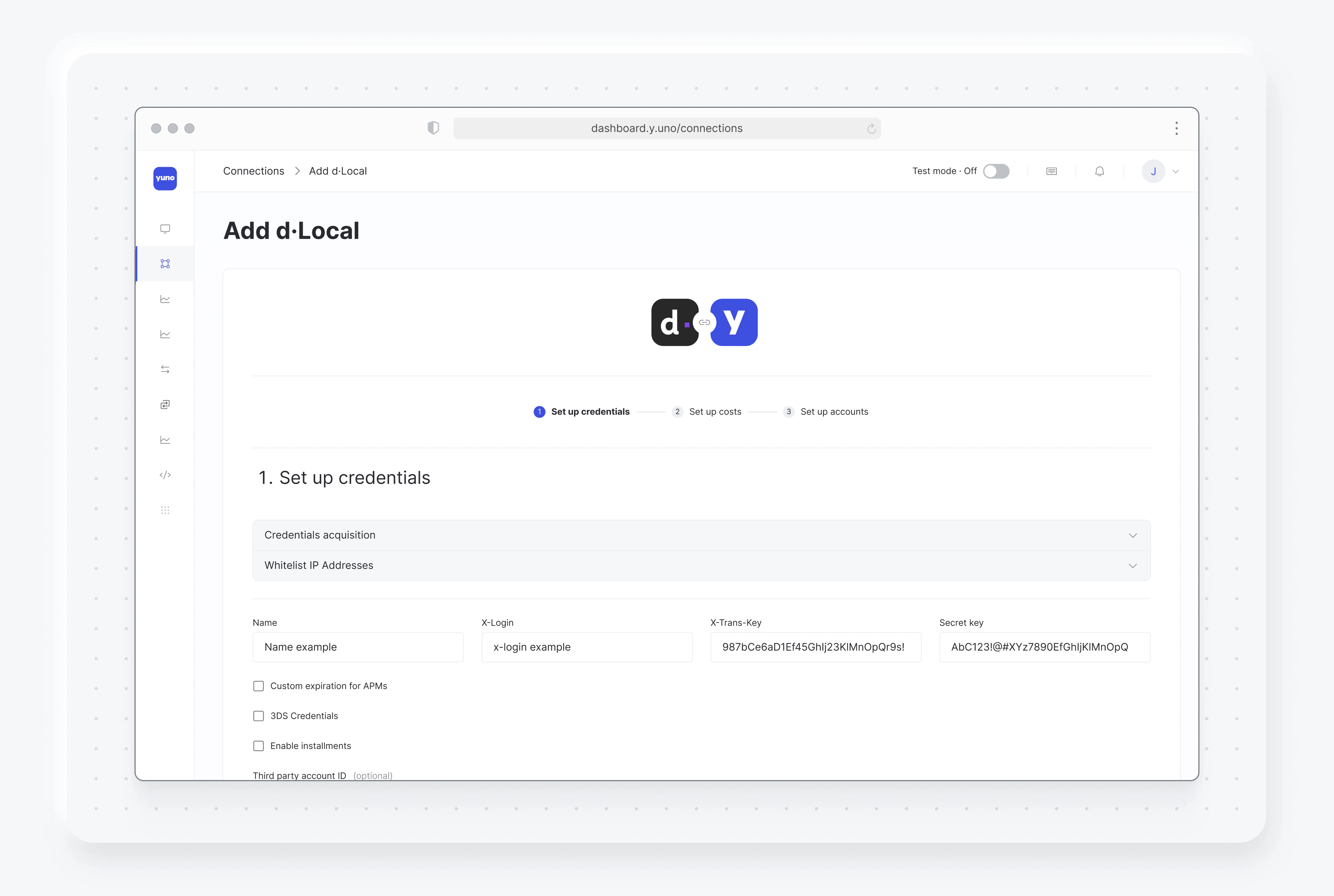 - After selecting a provider, you will start the quick three-step process to configure the connection. First, you will be asked for provider credentials, necessary to establish a secure connection. Enter a memorable name for the connection and then enter the details required. The specific information you must enter will vary by provider, though you’ll most likely have this data beforehand. Feel free to reach out to the provider in case you’re unsure about any of these fields or missing information. Optionally, you may check 3DS Credentials and enter the required data to activate the feature. Click Next.