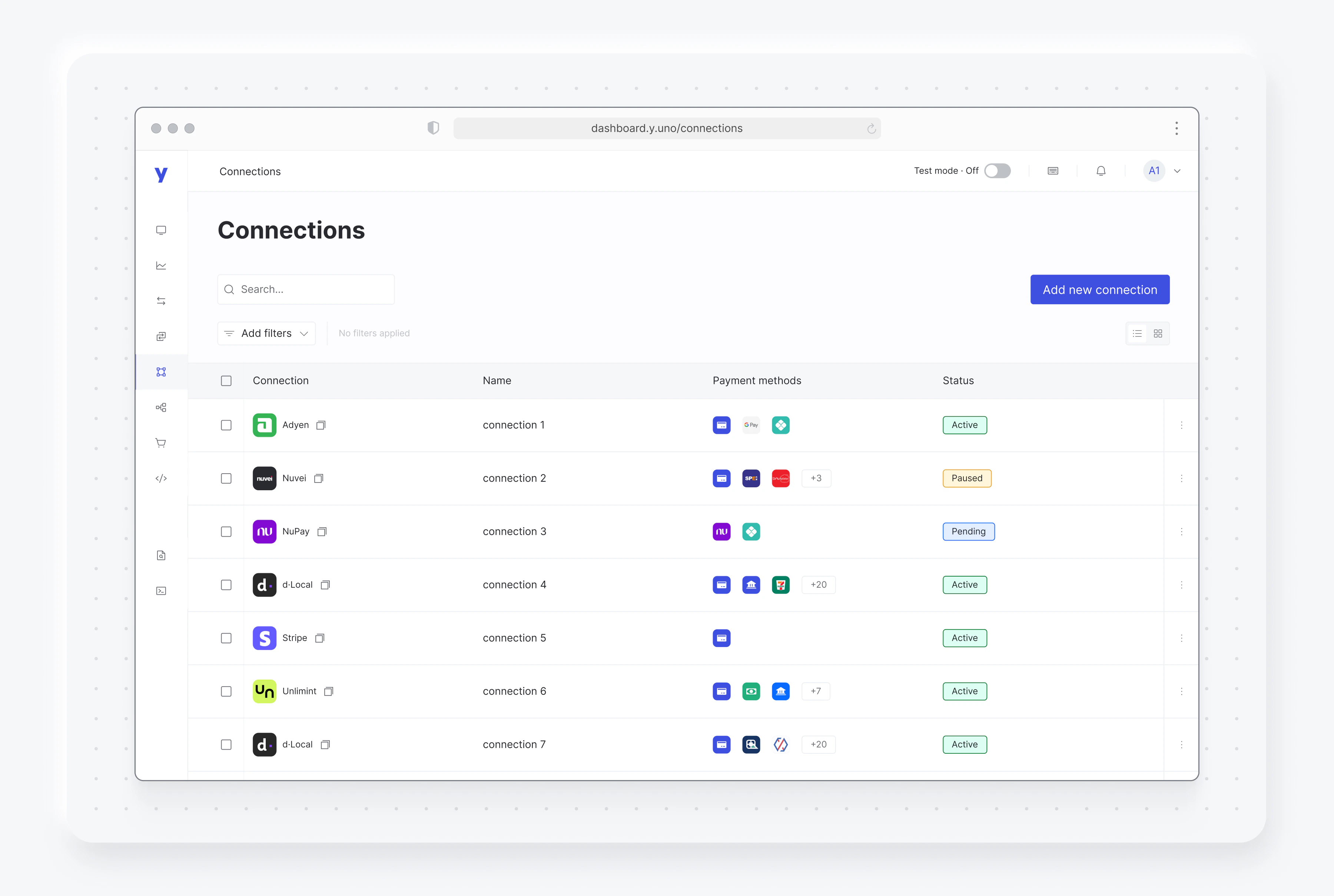 - With your connections set, you can proceed to the Routing section to configure payment processing routes using the provider and payment methods you have available within Yuno.