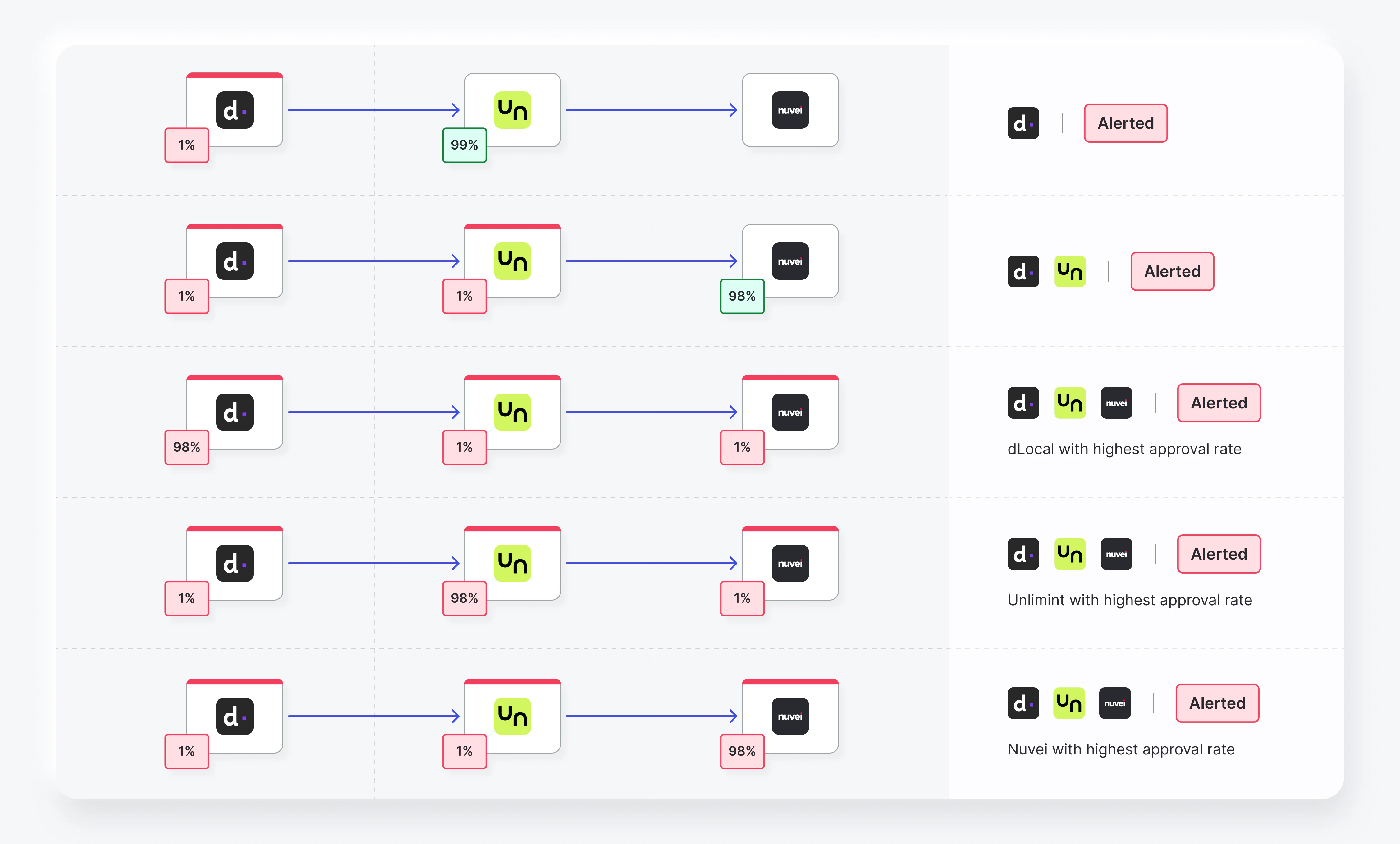 - If all providers are below threshold, traffic routes to whichever provider has the highest approval rate