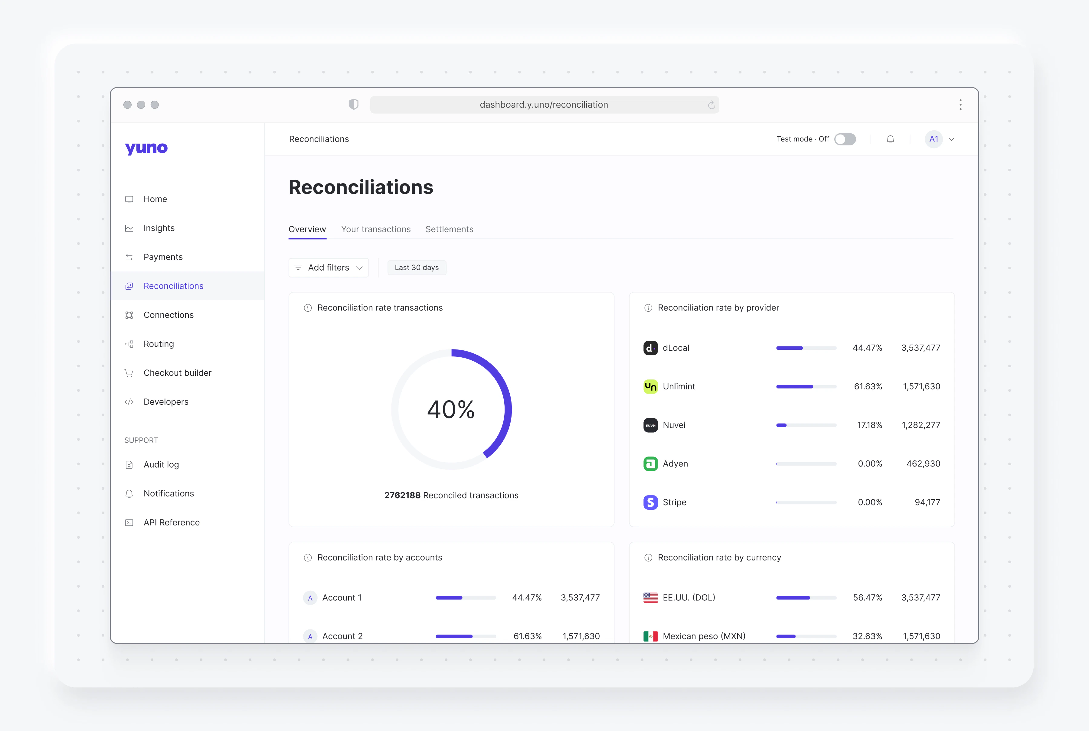 Yuno provides a comprehensive transaction reconciliation process that helps you:- Ensure proper payment accreditation
