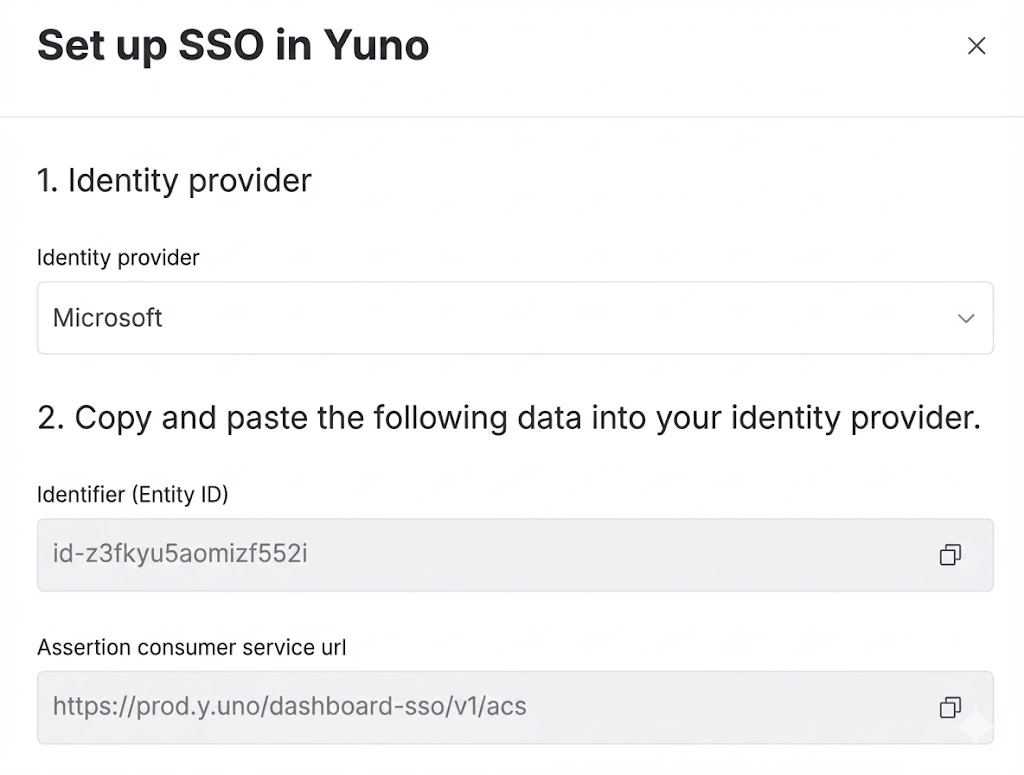 In Microsoft Entra ID, go to:Enterprise applications → All applications → Your application → Single sign-onUnder Basic SAML configuration, enter the values from the Yuno dashboard.