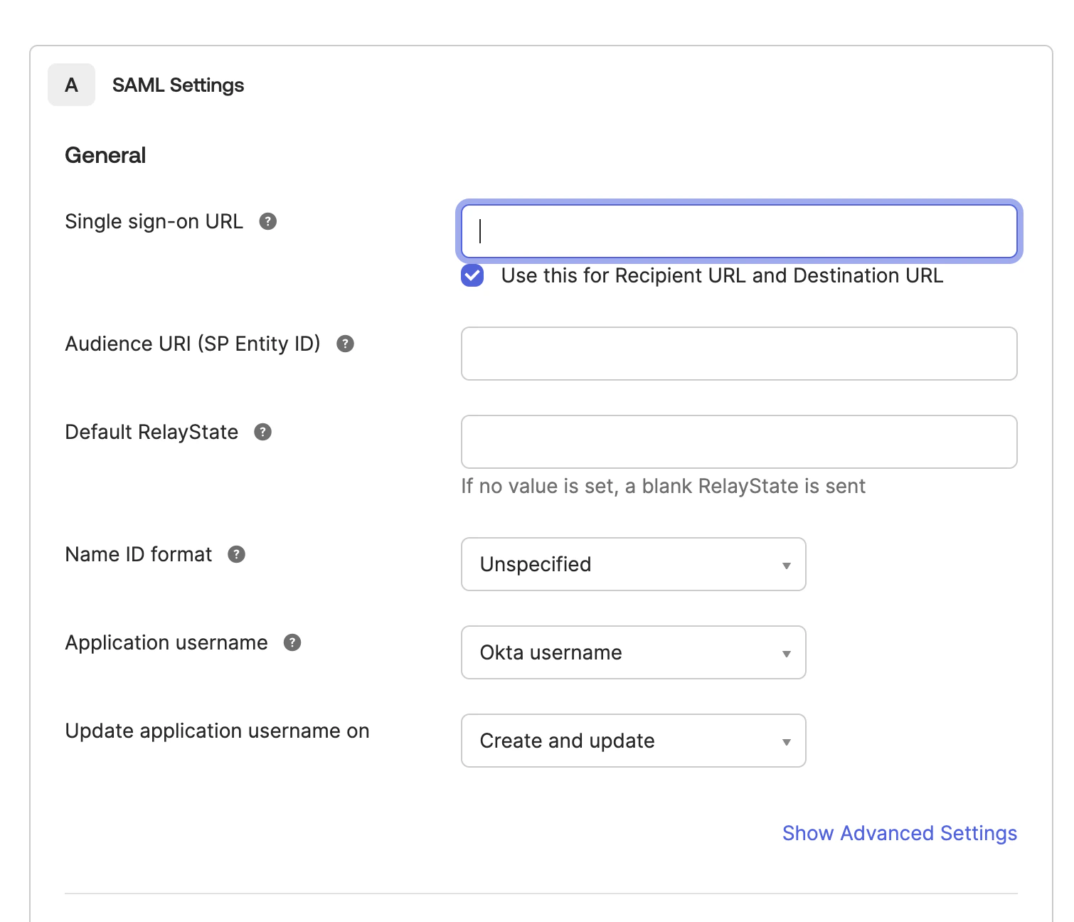 In Okta, go to:Applications → Create App Integration → SAML 2.0 → NextSelect a name for your application and, optionally, upload a logo. You will then see the SAML configuration form.