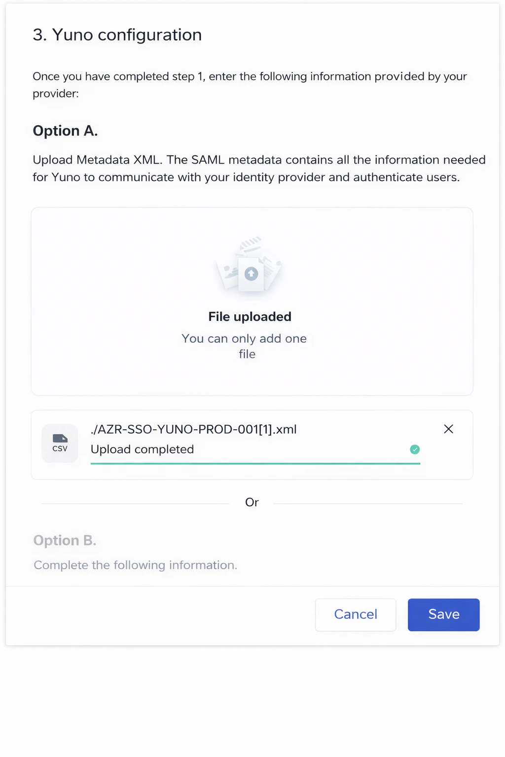 metadata.xmlfile under Yuno configuration → Option A: Upload metadata XML - Wait for the Upload completed confirmation