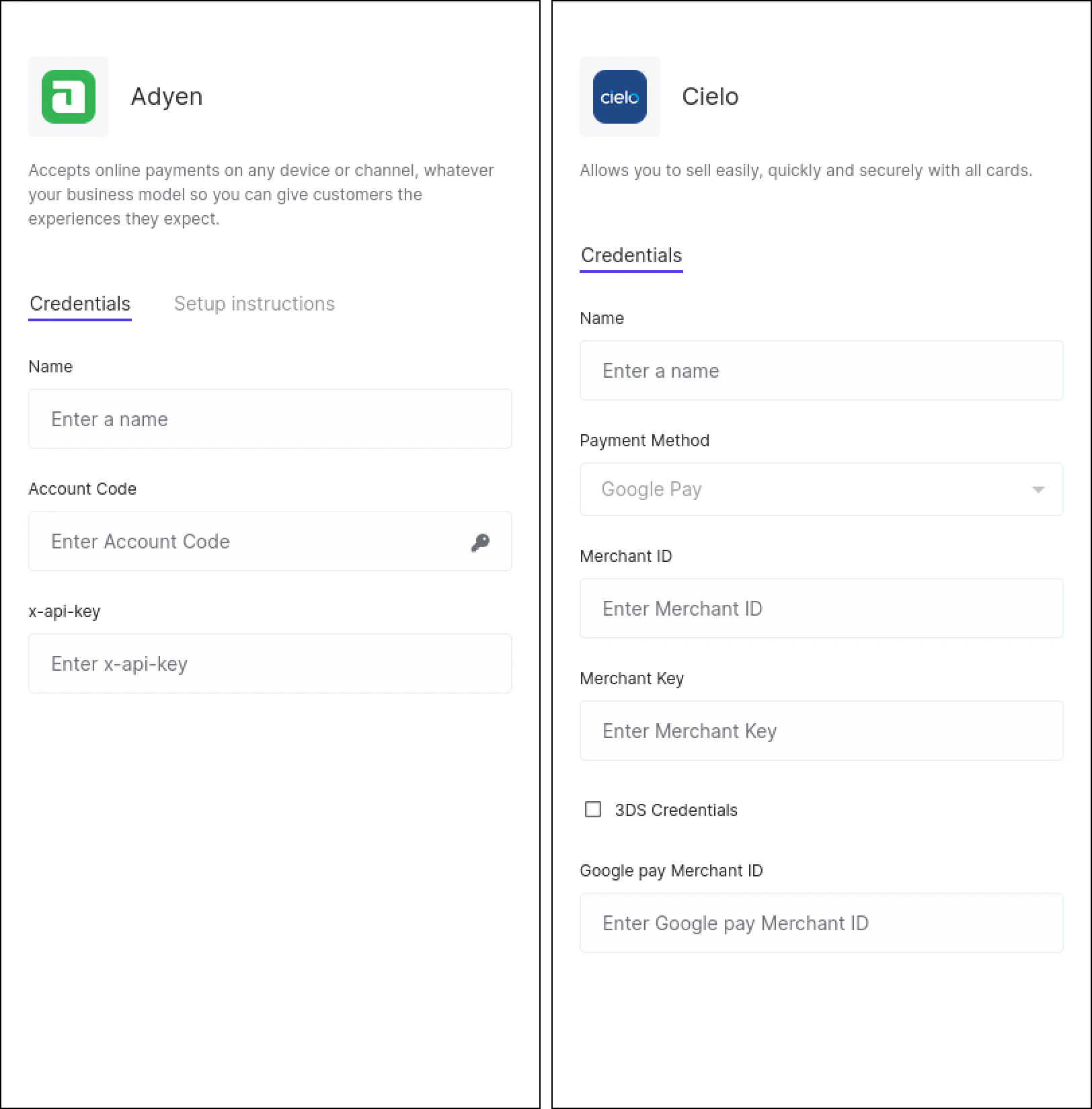 - Within the Yuno dashboard, select the Connections tab. Find the provider you choose and click Connect. Fulfill the side panel fields with your credentials. Below, you will find examples of connecting panels for Adyen and Cielo.