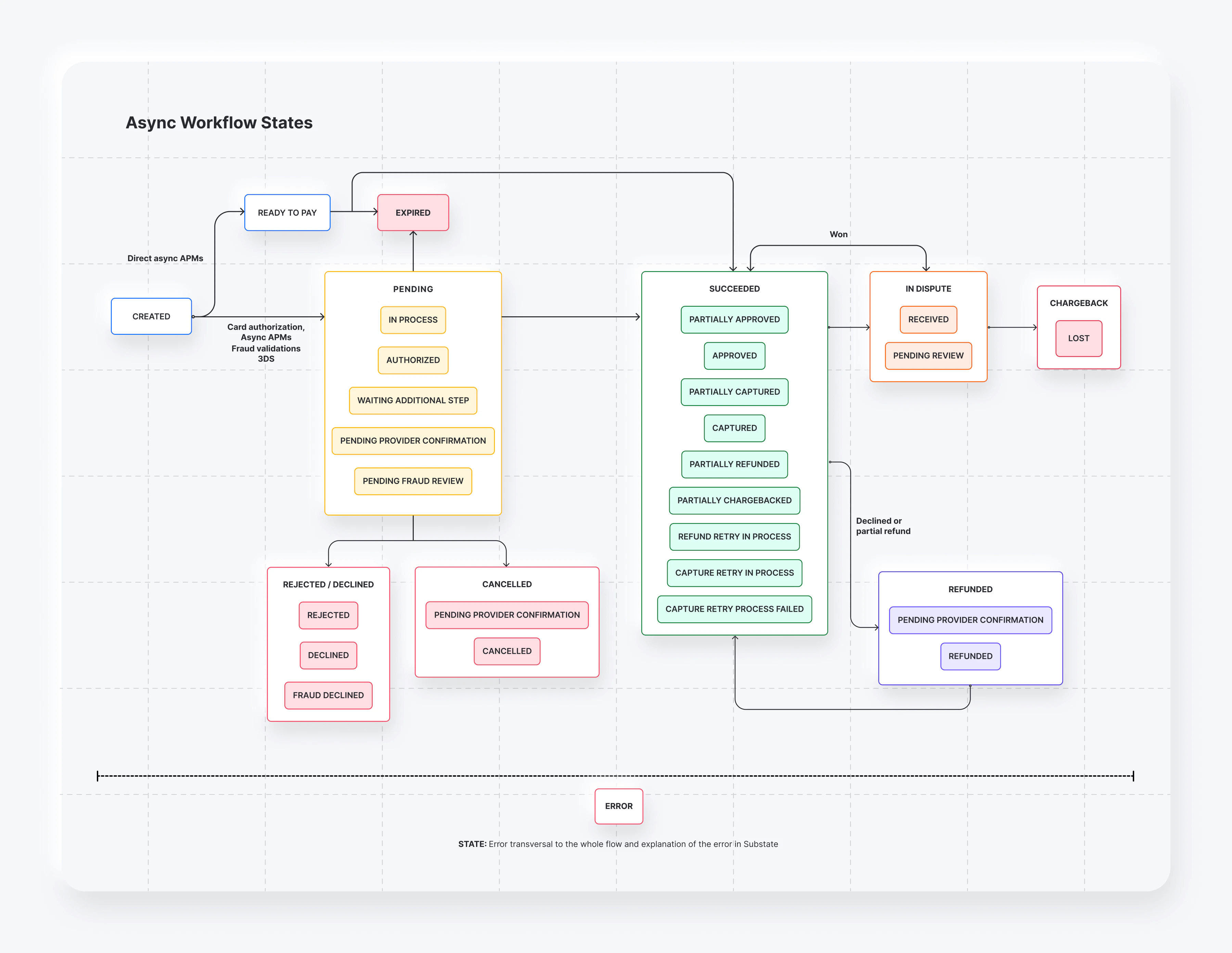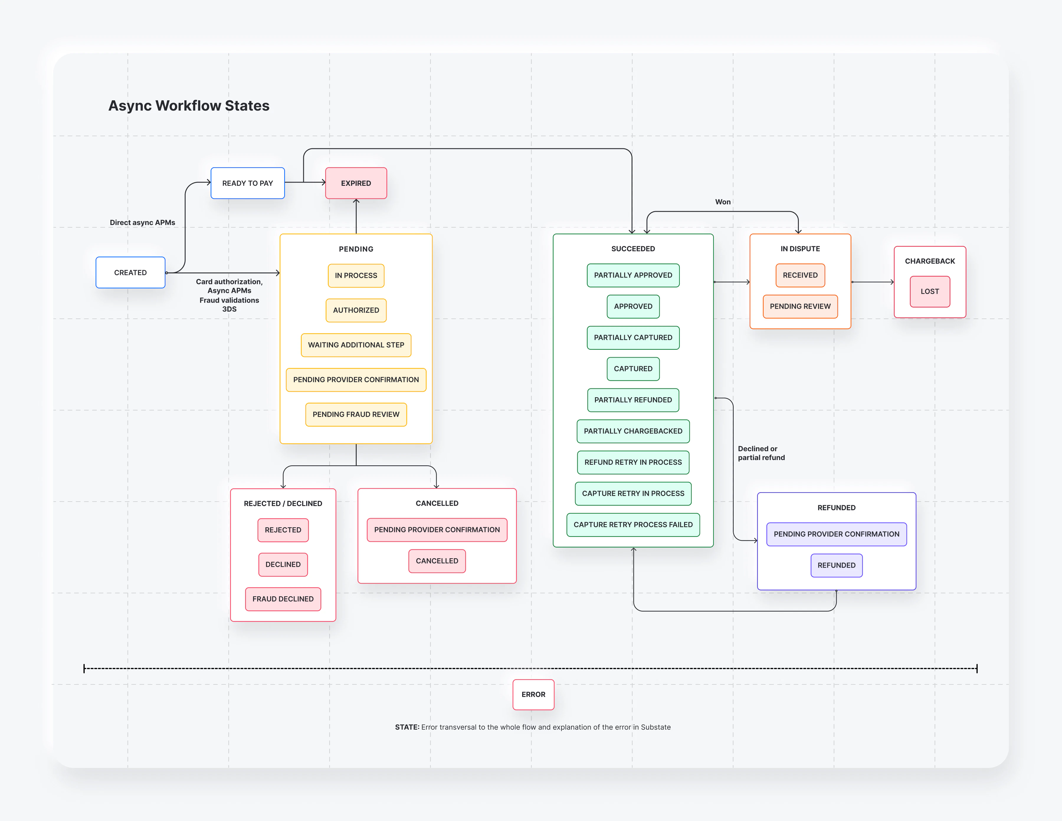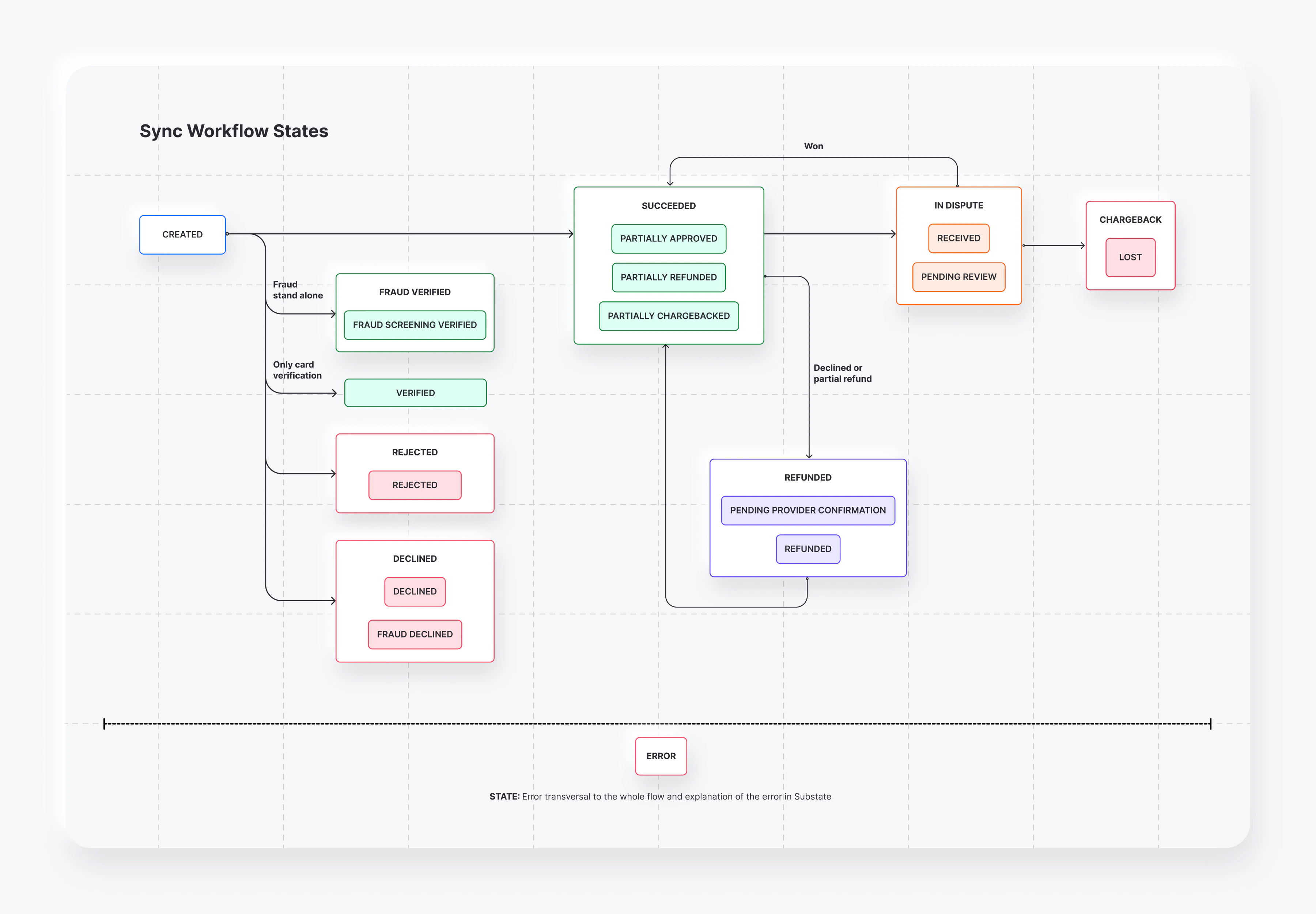 PREVENTED is a transaction status only for type = CHARGEBACK when the provider/network reports a predispute deflection. In these scenarios, only the chargeback webhook is sent; no refund webhook is emitted.REVIEW_WON is a chargeback transaction status only. When a chargeback is won, the payment returns to its previous status (for example, SUCCEEDED / APPROVED) and no new payment status is emitted.Possible states for sync and async flows